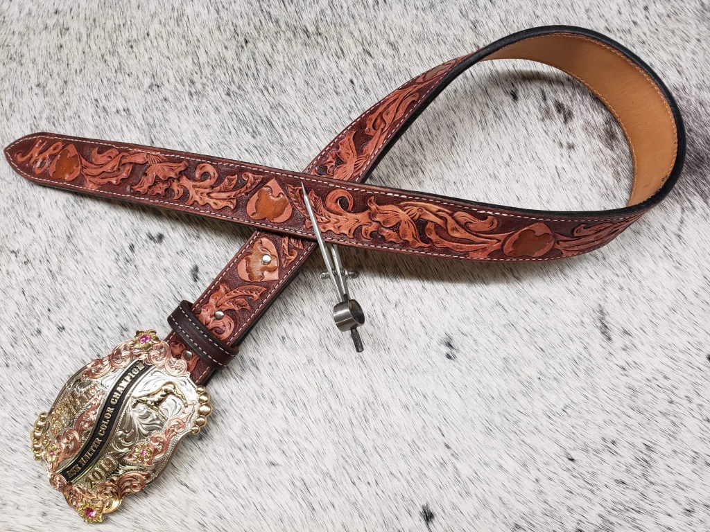 I decided last year if I won the championship with Annie, I was going to have a belt made for the buckle to hang on. I envisioned hearts and a hidden Mickey Mouse on the belt since that is what solidified that Annie was meant to be my horse when I saw her pictures that the rescue took the night she went to auction as a throw away horse, too skinny for even the auction house to let her through. One of the things I was most looking forward to was the smell of the leather. I am still a scratch and sniff kid I guess.
